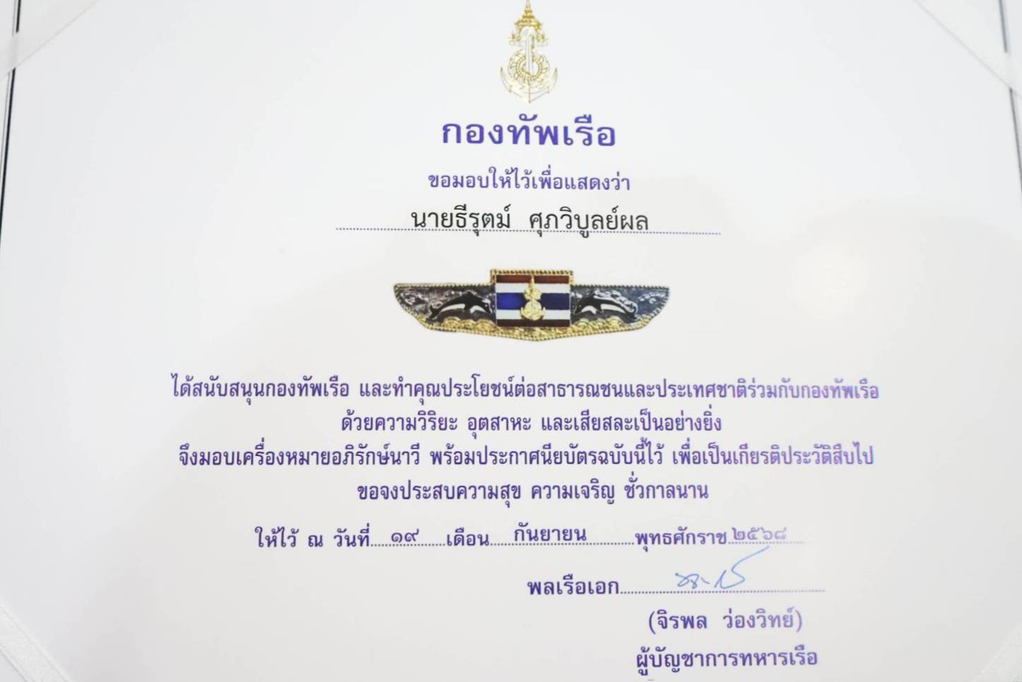 "ผบ.ทรภ.2 เป็น ผู้แทน ผบ.ทร. มอบเครื่องหมาย อภิรักษ์นาวี"
