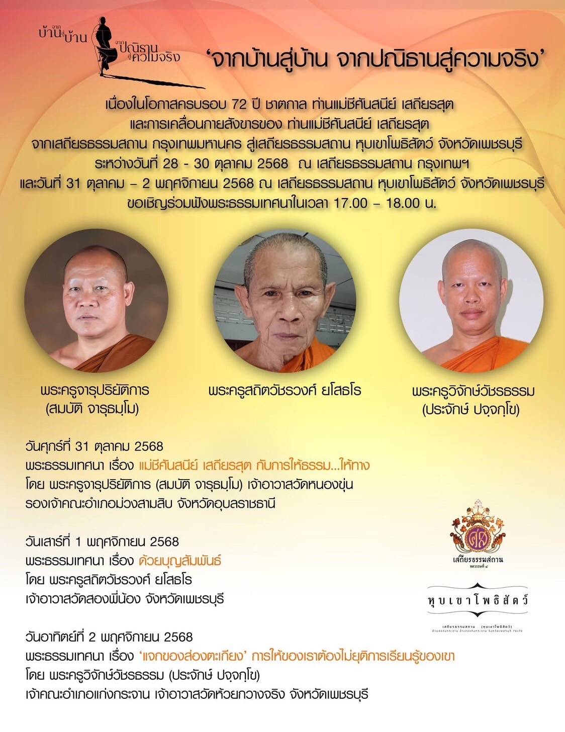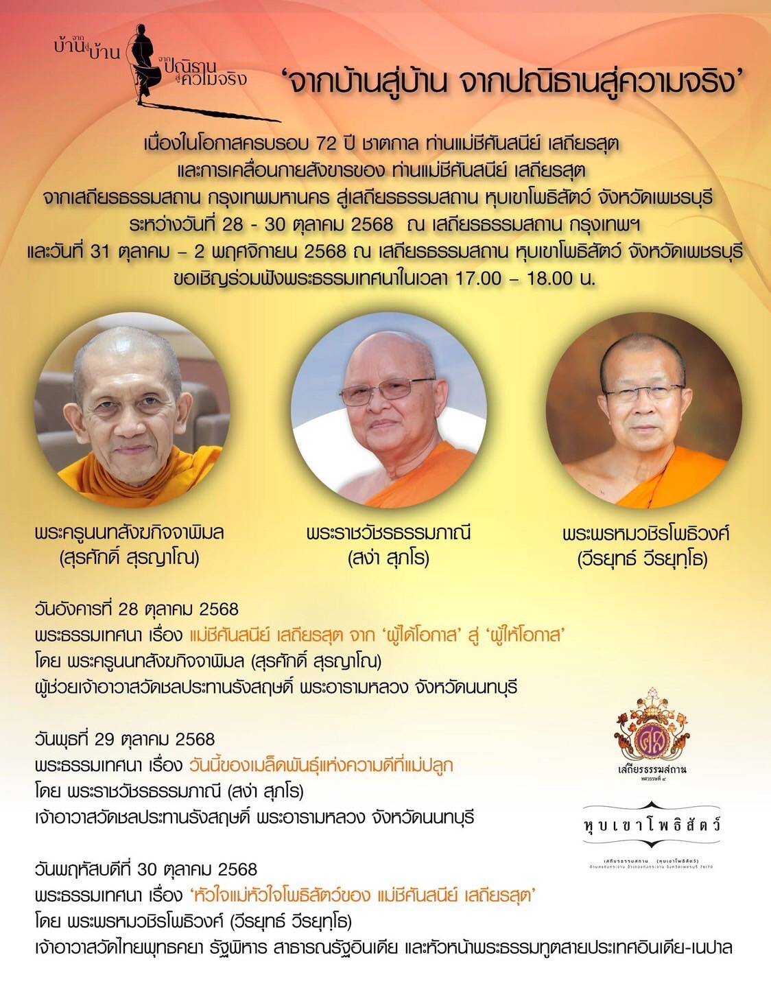 นางสายสัมพันธ์ กล่าวต่อไปว่า สำหรับกำหนดการงาน ‘จากบ้านสู่บ้าน จากปณิธานสู่ความจริง’ เนื่องในโอกาสครบรอบ 72 ปี ชาตกาล และการเคลื่อนกายสังขารแม่ชีศันสนีย์ จากเสถียรธรรมสถาน สู่หุบเขาโพธิสัตว์ จ.เพชรบุรี ดังนี้ วันที่ 28 - 30 ต.ค. ณ เสถียรธรรมสถาน กรุงเทพฯ การปฏิบัติภาวนาในกิจกรรม Spiritual Trip ตั้งแต่เวลา 10.15น. และสวดพระอภิธรรมตั้งแต่เวลา 18.23 น. เป็นต้นไป โดยระหว่างวันที่ 28-30 ต.ค. เวลา 17.00 - 18.00 น. จะมีการแสดงพระธรรมเทศนา โดยวันที่ 28 ต.ค. เรื่อง แม่ชีศันสนีย์ เสถียรสุต จาก ‘ผู้ได้โอกาส’ สู่ ‘ผู้ให้โอกาส’ โดย พระครูนนทสังฆกิจจาพิมล ผู้ช่วยเจ้าอาวาสวัดชลประทานรังสฤษดิ์ วันที่ 29 ต.ค. เรื่อง วันนี้ของเมล็ดพันธุ์แห่งความดีที่แม่ปลูก โดย พระราชวัชรธรรมภาณี เจ้าอาวาสวัดชลประทานรังสฤษดิ์ วันที่ 30 ต.ค. พระธรรมเทศนา เรื่อง ‘หัวใจแม่หัวใจโพธิสัตว์ของ แม่ชีศันสนีย์ เสถียรสุต’ โดย พระพรหมวชิรโพธิวงศ์ เจ้าอาวาสวัดไทยพุทธคยา สาธารณรัฐอินเดีย และหัวหน้าพระธรรมทูตสายอินเดีย-เนปาล ส่วนวันที่ 31 ต.ค. ครบรอบ 72 ปี ชาตกาล แม่ชีศันสนีย์ จะมีพิธีเคลื่อนกายสังขาร แม่ชีศันสนีย์ สู่หุบเขาโพธิสัตว์ ตั้งแต่เวลา 03.00น. เมื่อถึงหุบเขาดพธิสัตว์ เวลา 14.00-15.30 น. จะมีกิจกรรม Spiritual Talk เวลา 17.00-18.00 น. พระธรรมเทศนา เรื่อง แม่ชีศันสนีย์ เสถียรสุต กับการให้ธรรม...ให้ทาง โดย พระครูจารุปริยัติการ เจ้าอาวาสวัดหนองขุ่น จ.อุบลราชธานี จากนั้นวันที่ 1-2 พ.ย. ที่หุบเขาโพธิสัตว์ จ.เพชรบุรี จะมีการจัดปฏิบัติภาวนาถวาย แม่ชีศันสนีย์ ตั้งแต่เวลา 09.00-16.00 น. ด้วย สอบถามข้อมูลเพิ่มเติมได้ที่ line : @sdsline หรือ โทร. 02-510-6697