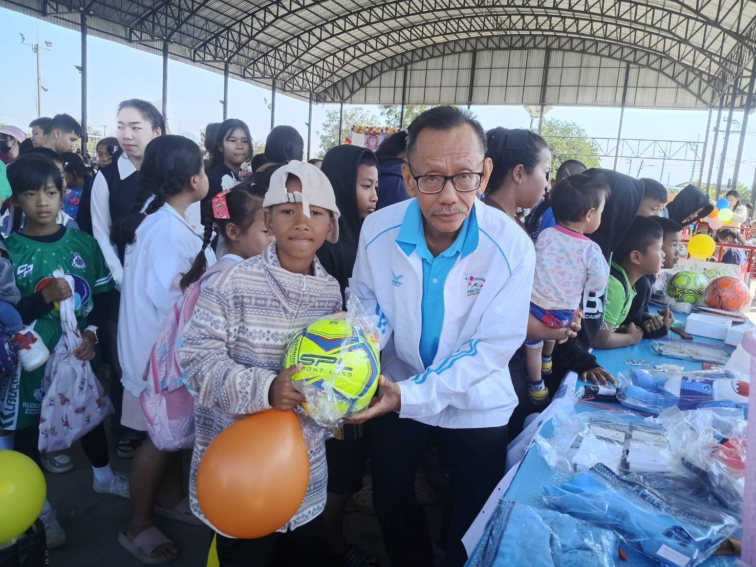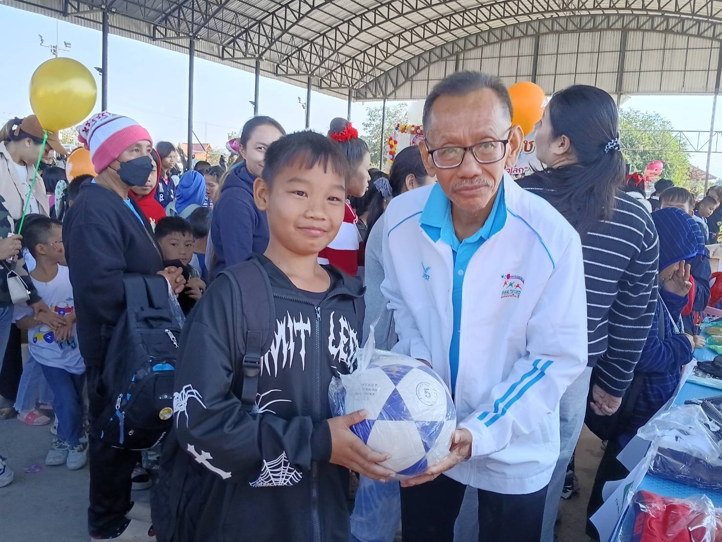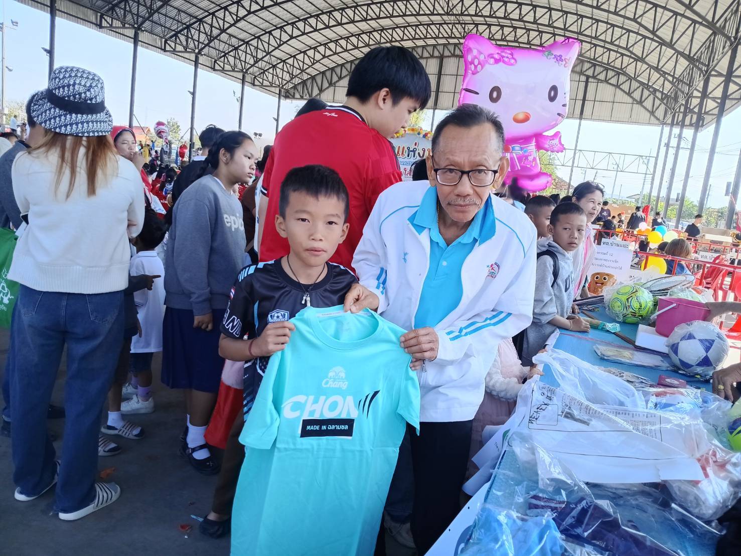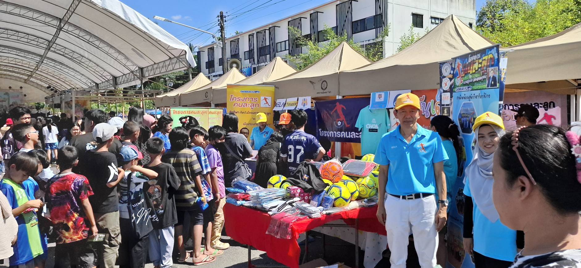 สำหรับลานกีฬาเทศบาลตำบลบ้านแปะ นายสุรกิจ บุญทา รองนายกเทศมนตรีเทศบาลตำบลบ้านแปะ(คนกลาง)เข้าเยี่ยมบูทโครงการคนละลูก